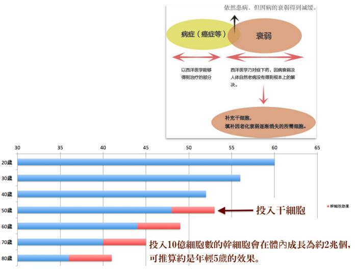 经年累月身体的消耗会造成细胞的损伤,需要非常多数量的干细胞。若不经由外在投与干细胞,自然回复通常需要 10 年的时间。若是消耗量大(根据癌症种类、癌症的分期,术后抗癌药的用量或化疗的程度等等做总和判断)我们建议做脐帯血干细胞的10亿个细胞量。若没有这么大量的消耗,自体干细胞10 亿个量也是个不错的选择。