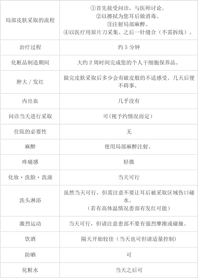 细胞采取:进行采集您的血液与皮肤细胞(耳后约 5mm 大小的皮肤)。所需时间大约 10 分钟 |
