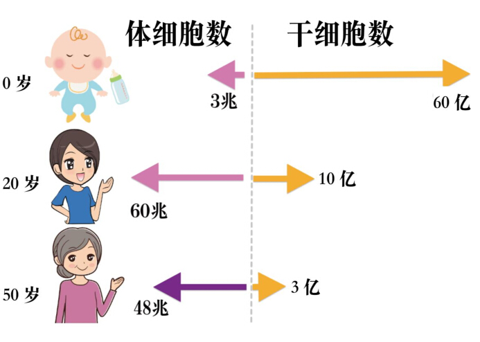 如下图所示,婴儿时期干细胞含量丰富并且慢慢成长为体细胞。成人后干细胞数量随年龄减少,慢慢无法应付身体新陈代谢量所需的体细胞。所以补充自体(自己培养)干细胞的话,就能够止住细胞骤减的齿轮。