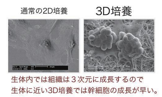 以往的2D(平面)培养方式,因细胞是横向扩增生长,有成长上限。(被限制)在三次元的空间内产生细胞与细胞之间的接触,彼此的刺激传达也是立体的。内部的细胞以扩散效果碰触培地或药剂