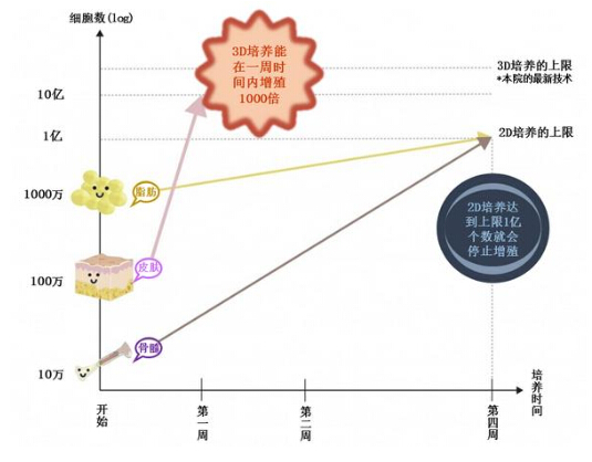 相较之下脂肪的干细胞含量比皮肤要多,但是不通过脂肪吸引(抽脂手术)采取,是没办法取得需要量的脂肪的。本院使用3D培养法能够在短时间内以胜过其他医院数百倍的技术来做增殖,就算一开始取得的干细胞数量较少也能够在瞬间增生到所需的细胞数量(3D培养远胜过其他培养技术)。