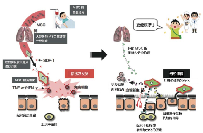 干细胞能够抓住由损伤部位发出的 SDF-1 讯号,往正确方向行进。一旦完成进行损伤部位的治疗,便会往下一个发出讯号的损伤部位前进。(打带跑现象)MSC: Messenchymal StemCell 间叶系干细胞
